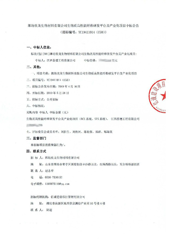 2019年5月28日,濰坊欣龍生物材料有限公司生物質(zhì)高性能纖維研發(fā)平臺(tái)及產(chǎn)業(yè)化項(xiàng)目(DCS系統(tǒng)、SIS系統(tǒng))公開(kāi)開(kāi)標(biāo),江西泰德工程有限公司中標(biāo)。